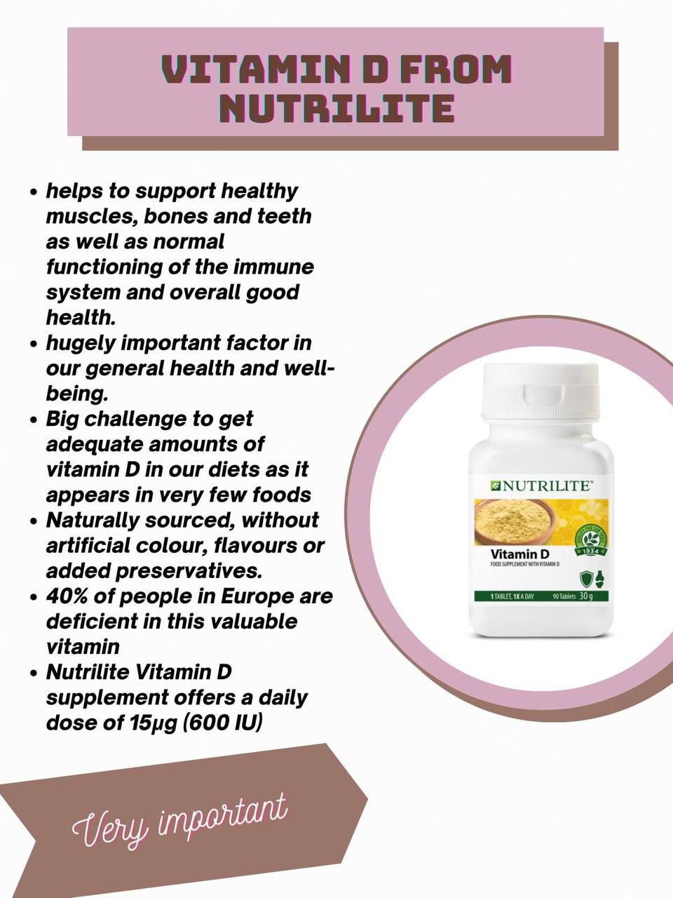 Nutrilite Vitamin D (Order No. 119797)To help to support healthy muscles, bones and teeth as well as normal functioning of the immune system and overall good health.