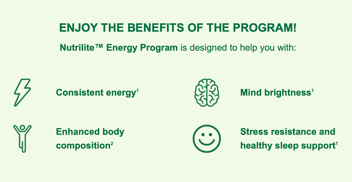 Powered by science, backed by nutritionists, Nutrilite™ Energy Program is easy-to-follow 40-30-30 meal concept including new delicious balanced snacks, ideal for hectic life, together with targeted supplementation and easy workout for you to feel good and have consistent energy and mind brightness1 all year round.